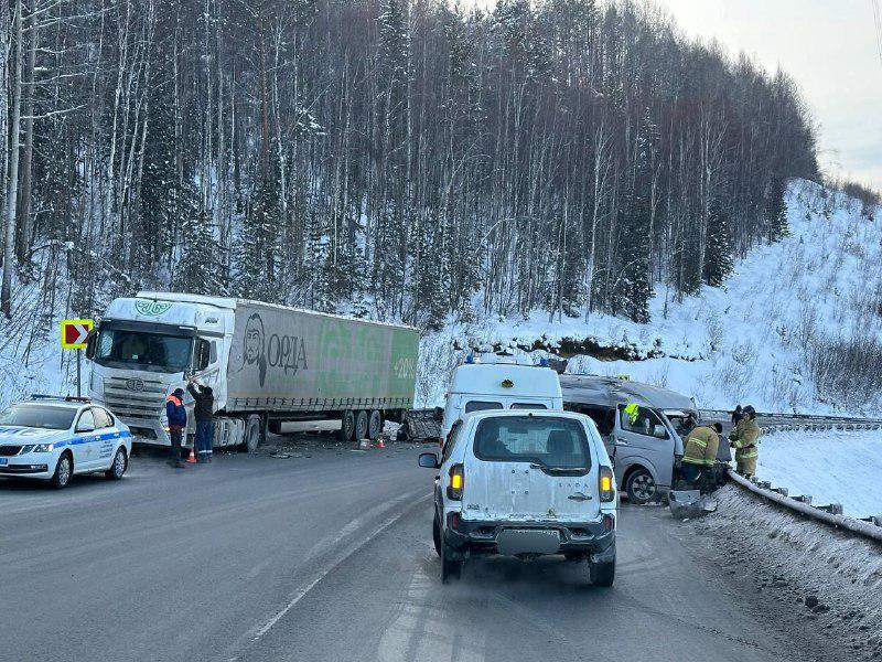 По данным региональной Госавтоинспекции, на 124-м километре федеральной трассы «Байкал» столкнулись два большегруза и микроавтобус Toyota Hiace с пассажирами, следовавшими из Иркутска в Улан-Удэ.